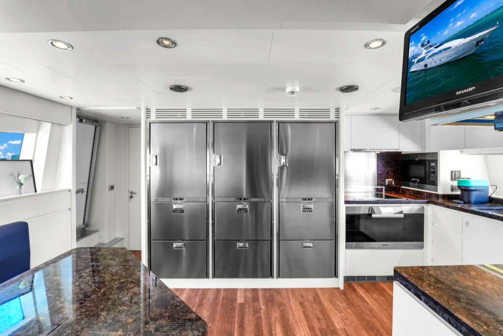 Sale Vita comes equipped with an impressive collection of premium water toys. You’ll have access to two Jet Skis for high-speed adventures across the bay. Additionally, three Seabobs invite you to explore Miami’s underwater world with ease. The floating lounge provides the perfect spot for relaxing on the water. As a result, you’ll enjoy endless entertainment whether you prefer adrenaline or relaxation.