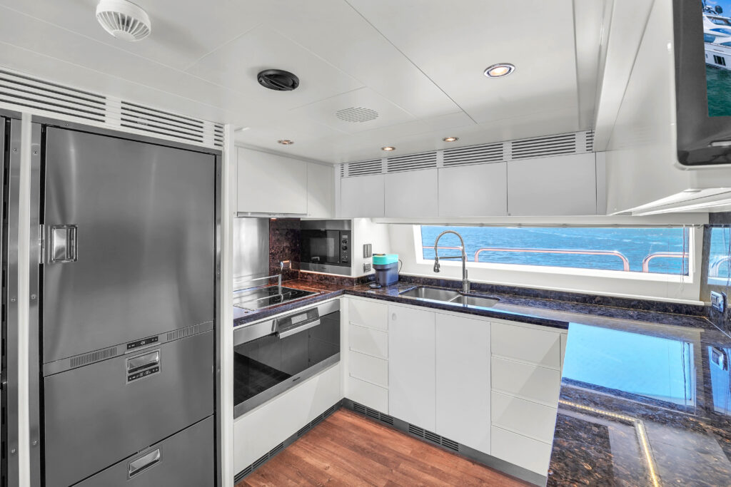 Inside, Sale Vita welcomes up to 10 overnight guests across five elegantly appointed staterooms. Each cabin showcases meticulous craftsmanship and ultimate comfort. Every inch of this yacht reflects Azimut’s hallmark Italian design philosophy. Modern luxury blends seamlessly with timeless elegance throughout. Additionally, four well-appointed bathrooms ensure convenience for all guests. The interior spaces flow effortlessly from entertaining areas to private retreats. Furthermore, floor-to-ceiling windows bathe the salon in natural light while framing stunning water views.